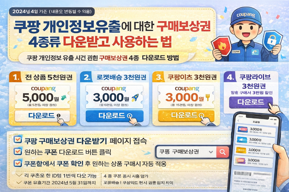 쿠팡 개인정보 유출 사태로 최대 10만원 상당의 구매보상권을 받을 수 있는데 신청 방법을 몰라 놓치는 분들이 많습니다. 4가지 종류의 보상권을 모두 다운받고 사용하는 절차는 생각보다 간단하며, 유효기간 내에만 사용하면 추가 비용 없이 혜택을 누릴 수 있습니다. 지금 바로 5분 투자로 보상권 받는 방법을 확인하세요.